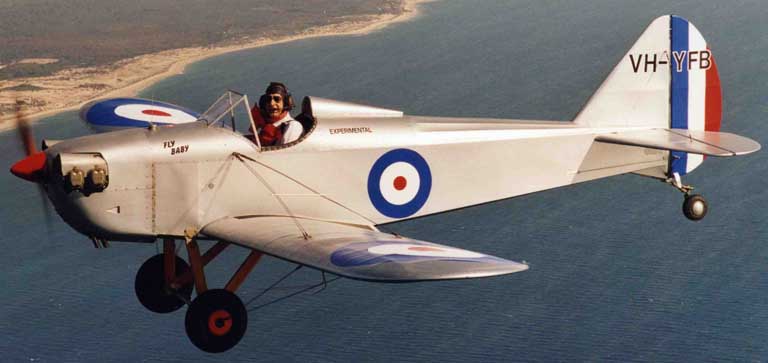 In reality, of course, it's aviation author Bob Grimstead's take at turning a Fly Baby into a Faux Fighter. VH-YFB began life as the first Fly Baby in Oz, built by Ron MacPherson. The late Mr. MacPherson dearly loved the plane... rumor has it that the "VFB" of the registration stands for, "You F***ing Beauty."