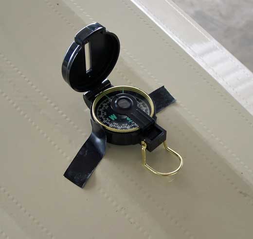 I tried the compass on the wingtip, but realized it was too close to the flashing along the leading edge. I settled on the aft turtledeck, halfway between the metal baggage area and the start of the vertical stabilizer. The position was perfect...I'd be positioned right at the compass when it came time to push the tail around.