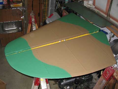 I paint the first coat with a 2" foam brush, cross-wise to the airflow over the surface. I apply the paint with a fair pressure on the brush to work the latex into the fabric weave, but not so much as to cause dripping on the inside of the fabric. The idea is to thin the paint enough to allow it to be worked easily into the weave but no more. Each coat of latex-primer-mix must be applied as thin as possible. The fabric areas previous coated in the Polybrush take the paint well but must be fully cured prior to the latex application.